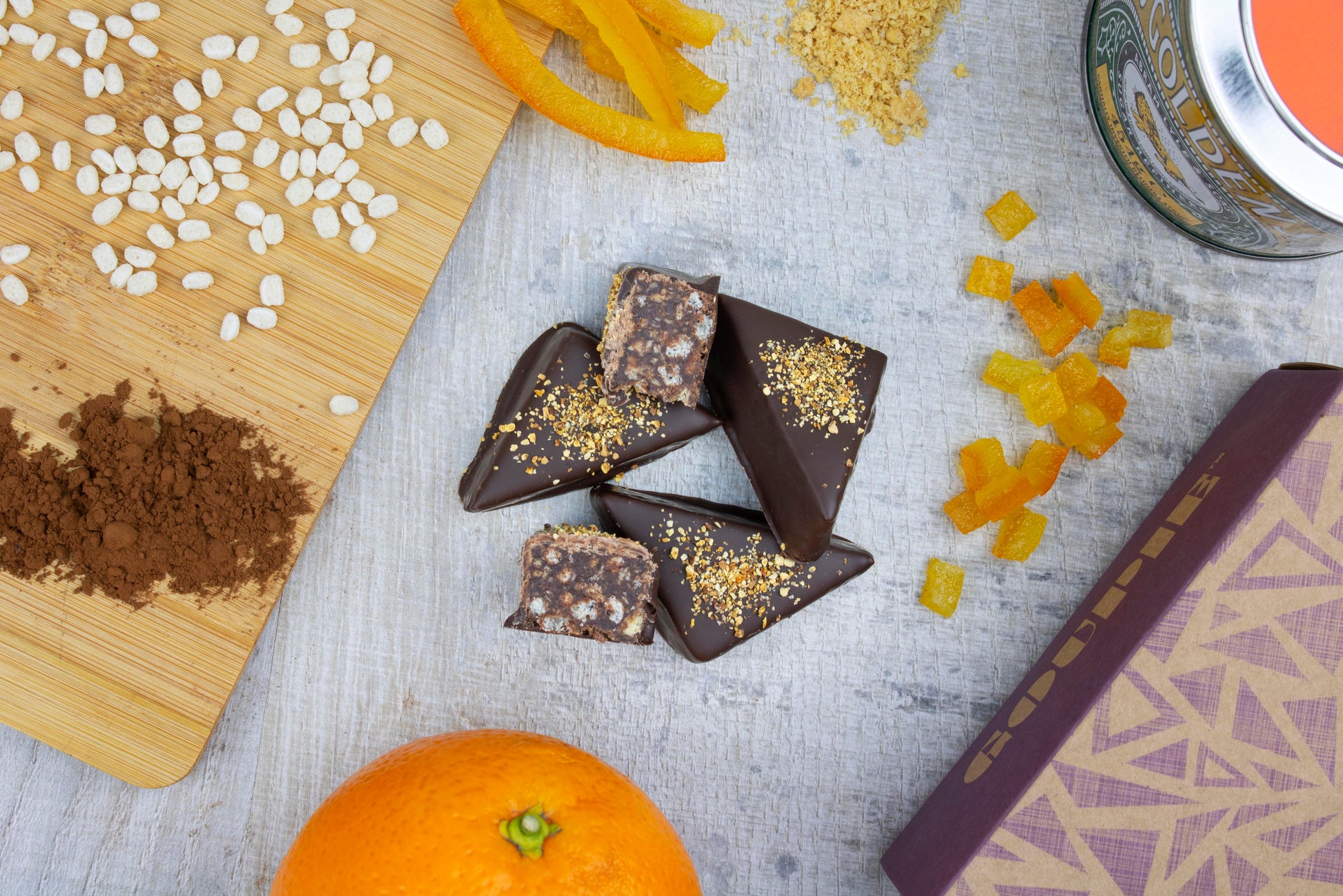 Chocolate orange lovers, this one’s for you! A cocoa-rich syrup base, filled with toasted rice, biscuit crumb, candied orange peel and orange essential oil before being coated in a 55% Belgian chocolate and topped with dried orange peel.