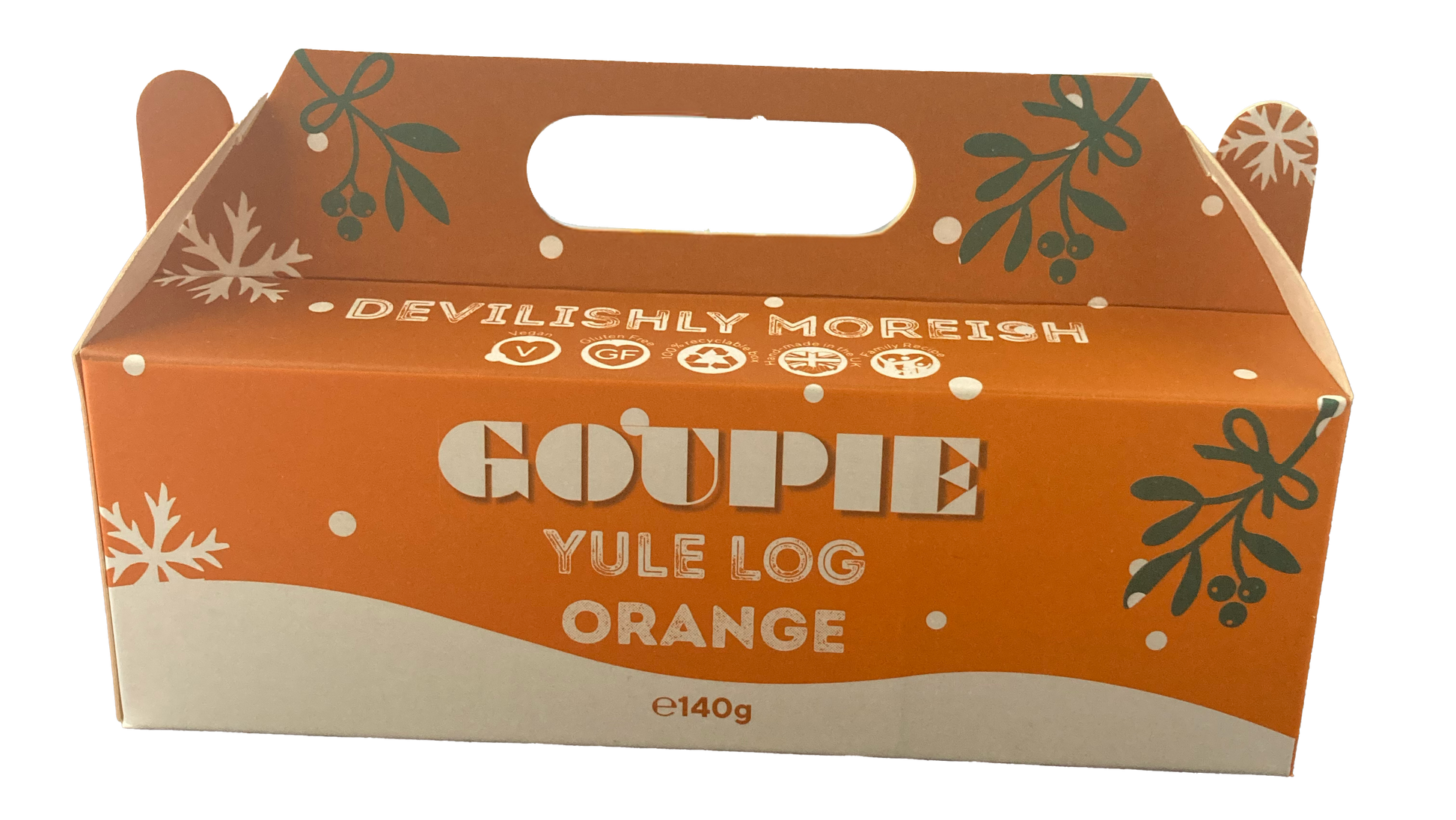 Brand new for Christmas: Goupie Yule Logs! Our Orange Yule Log mixes the bright citrus punch of orange with rich Belgian chocolate. Our cocoa-rich syrup base is filled with toasted rice, and candied orange peel to make up the centre of the log which is then wrapped in a thin layer of marzipan and finally coated in chocolate.