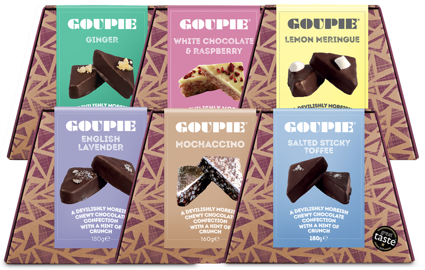 Ginger Goupie Golden Syrup, Dark Chocolate (27%)(min 55% cocoa solids, sugar, cocoa butter, soya lecithin, natural vanilla), Palm Oil (RSPO Certified), Crisped Rice (rice flour, rice bran, sugar, rice extract), Dates (dates, rice flour, cottonseed oil), Biscuit (brown rice flour, maize flour, potato flour, sugar, RSPO palm oil, dried rice syrup, sodiam bicarbonate), Crystallised Ginger (9%)(ginger, sugar, sulphur dioxide), Fairtrade Cocoa, potassium carbonate), Ground Ginger (1%) White Chocolate & Raspberry Goupie Golden Syrup, White Chocolate: (sugar, cocoa butter, rice syrup oowder, chickpea protein concentrate, emulsifier E322, natural vanilla flavouring)., Palm Oil (RSPO Certified), Crisped Rice (rice flour, rice bran, sugar, rice extract), Biscuit (brown rice flour, maize flour, potato flour, sugar, RSPO palm oil, dried rice syrup, sodiam bicarbonate), Ground Almonds, Raspberry Extract, Beetroot Powder, Freeze-Dried Raspberries Lemon Meringue Goupie Golden Syrup, Dark Chocolate (27%)(min 55% cocoa solids, sugar, cocoa butter, soya lecithin, natural vanilla), Palm Oil (RSPO Certified), Crisped Rice (rice flour, rice bran, sugar, rice extract), Ground Almonds (nuts), Marshmallow (7%)(tapioca syrup, cane sugar, filtered water, tapioca starch, carrageenan, soy protein, natural vanilla flavour), Candied Lemon Peel (4%)(lemon peel, sucrose, fructose, maltose, dextrose, citric acid - E330, preservative: potassium sorbate E202 & sodium metabisulphite E223 (sulphites<10ppm)), Lemon Essential Oil (1%) Mochaccino Golden Syrup, White Chocolate (20%)(cocoa butter (35%), sugar, maltodextrin, ground almonds, sunflower lecithin, salt, vanillin), Palm Oil (RSPO Certified), Crisped Rice (rice flour, rice bran, sugar, rice extract), Dates (dates, rice flour, cottonseed oil), Biscuit (brown rice flour, maize flour, potato flour, sugar, RSPO palm oil, dried rice syrup, sodiam bicarbonate), Cocoa (97.6% Fairtrade cocoa, potassium carbonate), Coffee (4%) Salted Sticky Toffee Golden Syrup, Dates (dates, rice flour, cottonseed oil), Dark Chocolate (27%)(min 55% cocoa solids, sugar, cocoa butter, soya lecithin, natural vanilla), Palm Oil (RSPO Certified), Treacle (invert sugar syrup, cane molasses), Crisped Rice (rice flour, rice bran, sugar, rice extract), Ground Almonds, Fairtrade Cocoa, Maldon Sea Salt Flakes English Lavender Golden Syrup, Dark Chocolate (27%)(min 55% cocoa solids, sugar, cocoa butter, soya lecithin, natural vanilla), Palm Oil (RSPO Certified), Crisped Rice (rice flour, rice bran, sugar, rice extract), Dates (dates, rice flour, cottonseed oil), Biscuit (brown rice flour, maize flour, potato flour, sugar, RSPO palm oil, dried rice syrup, sodiam bicarbonate), Fairtrade Cocoa, Lavandin Essential Oil (0.3%), Lavender Flowers (0.1%)