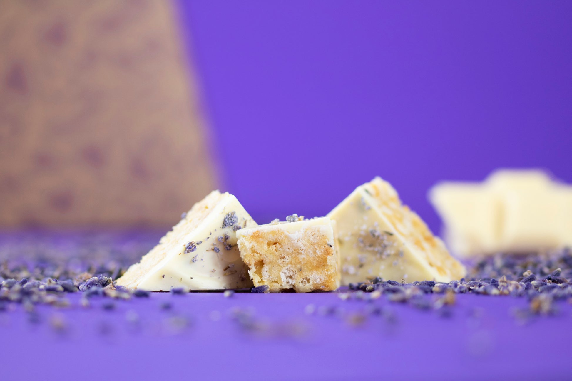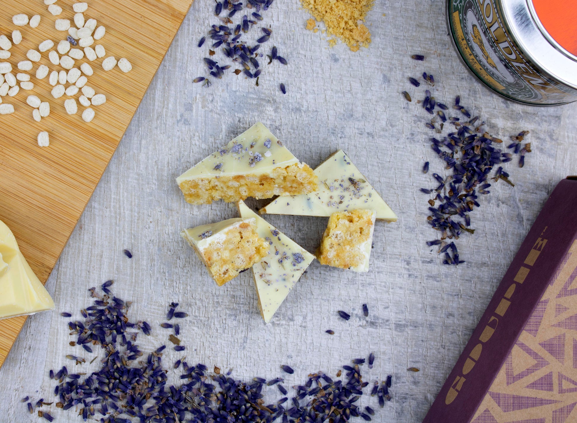 A sweet, and floral flavour! Our syrup base is filled with toasted rice, ground almonds and lavender petals before being topped in a creamy white chocolate and candied lavender petals.